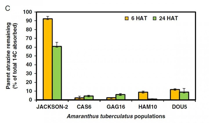 - Rapid metabolism of atrazine via GST conjugation conferred resistance in the populations tested. The metabolism-based resistance may trigger the evolution of cross-resistance to other herbicides, which may represent a challenge to effectively control common waterhemp in Nebraska and beyond.