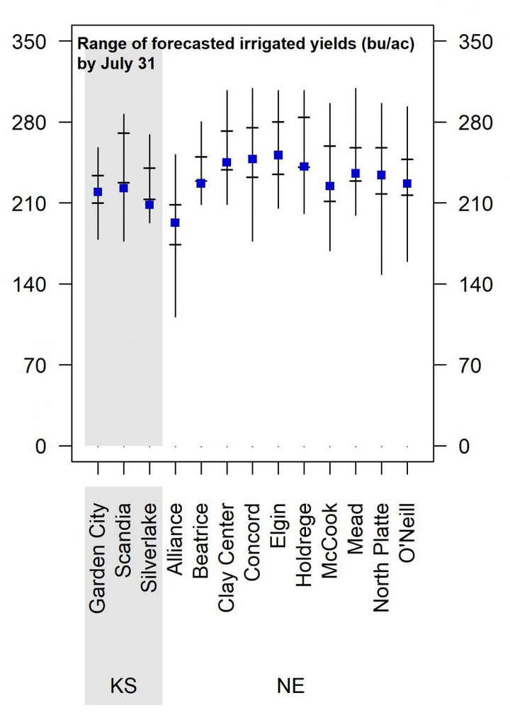 The range of forecasted irrigated corn yield potential for each location, as well as the probabilities for yields above, near, or below average, are shown in Figures 3 and 4 and in Table 1. There is a relatively small chance (
