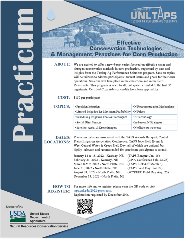 Practicum dates are associated with the TAPS Awards Banquet, Central Plains Irrigation Association Conference, TAPS June Field Event, and West Central Water and Crops Field Day, all of which are optional but highly relevant and recommended for practicum participants to attend.