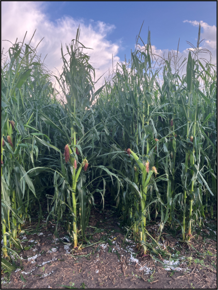 National Weather Service in North Platte reported 59 mph winds at their office east of town and had other locations throughout town that reported up to 70 mph winds with the storm. Along with the winds, the storm carried with it hail and although the hail wasn’t large in diameter, combined with the wind it was enough to affect the TAPS sprinkler corn, popcorn and subsurface drip irrigated (SDI) corn fields located on the south edge of North Platte at the West Central Research, Extension and Education Center (WCREEC).