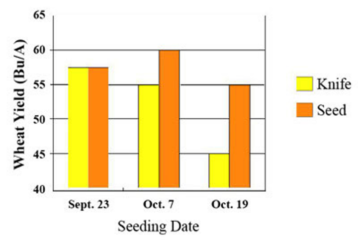 Winter wheat seeded late can result in higher winter wheat yields than winter wheat seeded earlier, especially when compared with winter wheat seeded much before the suggested dates (Table 1). This yield increase can be attributed to reduced disease and insect problems and the use of extra soil water and fertility used in the fall.