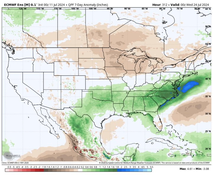 Condition ratings for corn came in at 80% good-excellent (G-E) against 4% poor-very poor (P-VP), while soybean checked in again at 77% G-E and 5% P-VP. Corn is well ahead of the five-year average with 21% in the silking stage. Soybean blooming and pod setting stages are also advanced compared to the five-year average.