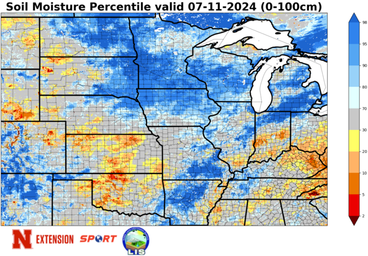 A look at the latest soil moisture percentiles map from SPoRT LIS suggests there is a decent reserve of soil moisture across most of eastern and central Nebraska. This should keep crop stress from the pending heat to a more minimal level, though a few more of these three- to four-day stretches of intense heat over the next six weeks will take high end off the yield regardless of moisture conditions. The prolonged heat in western Nebraska in the coming days is also likely to more rapidly deplete soil moisture, which could lead to further degradation on the Drought Monitor in the coming weeks.