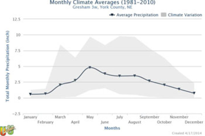 Figure 1. Record of 30 years of precipitation climatology for York, Clay Center, and Mead. The solid line represents average monthly precipitation; the gray areas represent variability in precipitation over the 30-year period. (Source: www.agclimate4u.org) (All figures link to larger versions.)