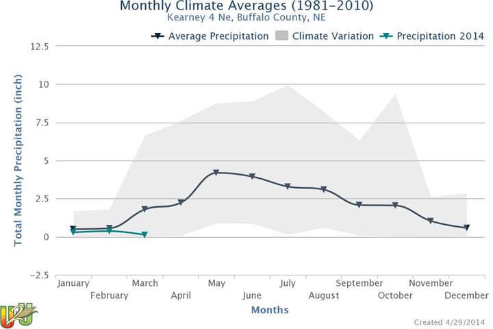 Climate, particularly at key growth stages, is a major factor of agricultural production. For example, corn growth is highly sensitive to temperature and moisture during the silking and grain filling growth stages. One great aspect of this tool is that it can translate 30 years of weather data into simple yet usable maps for your specific location. If you want to keep track of climate for this growing season and compare it with the long-term average, this tool can do that easily. For example, Figure 2 shows this year's rainfall in comparison with the long-term trend. By looking at this graph, we can easily determine that the March precipitation for Kearney was below normal compared to the 30-year average.