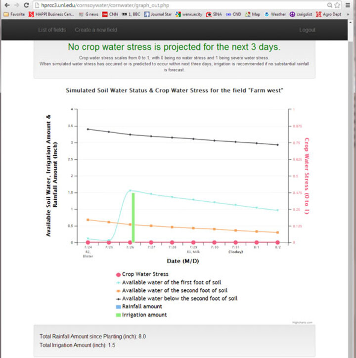 The real-time weather data comes from the weather station that is nearest to the specific field and is provided by the High Plains Regional Climate Center (http://www.hprcc.unl.edu/). The program shows simulation results for the past seven days and the next three days. The predictions for the next three days are based on the average weather conditions of the past three days. The output graph also shows rainfall and irrigation events of the past seven days (Figure 3), while the total rainfall amount since planting and the irrigation amount are reported below the graph (Figures 2 and 3).