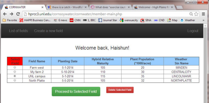 To use the CornWater program, a user must register (for free) for an account at the program website (http://hprcc3.unl.edu/cornsoywater/cornwater/). The user can then add their fields to the program (Figure 4). Note that a field will not be added to a user's account if the program can't find a weather station within 20 miles of the field.