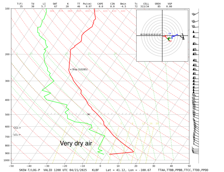 A look at the sounding from North Platte that morning shows the air mass was very dry, so even though radar returns were picking up light precipitation, it was evaporating before it hit the ground. In other words, the cold front had sufficient enough forcing to produce precipitation, but the air mass was too dry to oblige north-central Nebraska with any rainfall and instead just brought gusty winds. The observations and archived radar loop are available online.