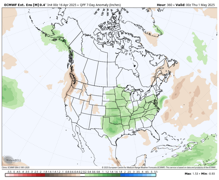 Additional evidence comes from the latest ECMWF weeklies, which shows precipitation being above average during the last part of the month. Severe weather risk will also be present, though it is too early to pinpoint exact times and types.