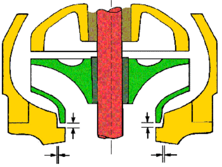 Vertical turbine pump assemblies use multiple stages to create the total head (pressure) required to lift the irrigation water level in the well to the soil surface and to supply the pressure needed for the distribution system to function properly. Figure 2 illustrates a cutaway of one stage of a multistage-enclosed impeller and bowl assembly as it would appear when first installed. Since the purpose of each stage of the pump assembly is to add pressure to the water, a seal must prevent the higher pressure water that has passed through the impeller from leaking back into the lower pressure area at the inlet (eye) of the impeller. This seal is created by the close tolerance between the skirt of the rotating impeller and the wear ring area of the stationary bowl.